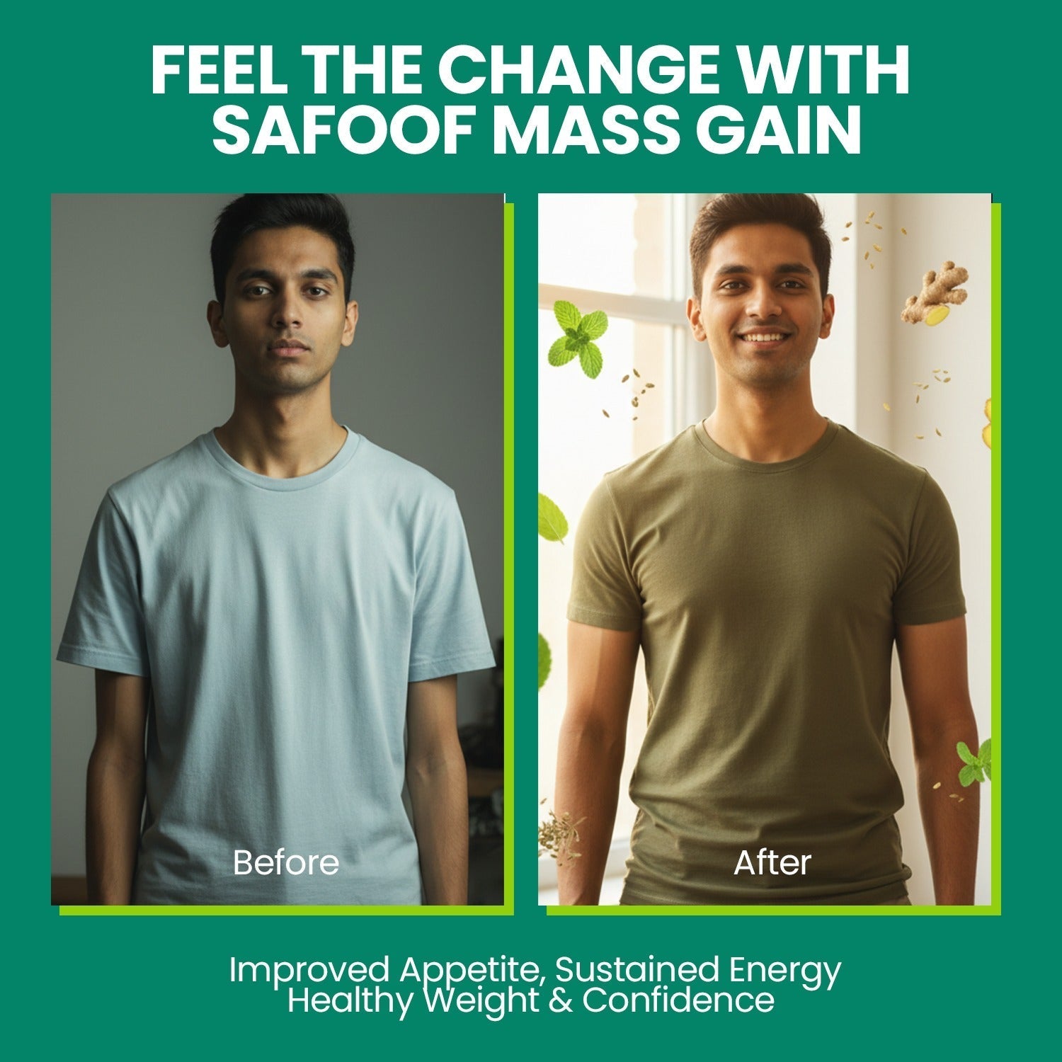 Unlock your body's natural potential with Safoof Mass Gain, a powerful herbal blend crafted to support healthy weight gain and overall vitality. Made from 100% natural ingredients sourced from trusted herbal farms, this unique formula is designed to improve digestion, enhance nutrient absorption, and boost metabolism - helping you achieve a balanced and healthy physique naturally. Each serving of Safoof Mass Gain is enriched with a synergistic mix of Kalwanji, Ajwain, Mint, Saunf, Ginger, Green Tea Extracts, and Carom Seeds, carefully selected for their time-tested benefits in traditional wellness. These potent herbs work together to strengthen appetite, improve gut health, and provide sustained energy throughout the day. •Kalwanji (Black Seeds):Supports metabolism and immunity. 。Ajwain & Carom Seeds: Promote healthy digestion and appetite. • Mint & Saunf (Fennel): Soothe the stomach and aid nutrient absorption. • Ginger: Enhances metabolism and energy levels. Green Tea Extracts: Rich in antioxidants to support overall wellness. Free from chemicals, preservatives, and arti..c additives, Safoof Mass Gain is safe for daily use and suitable for both men and women. Whether you're looking to build muscle, regain healthy weight, or simply feel more energized, this herbal formula is your natural partner on the journey to better health and vitality. Experience the power of nature. Gain strength, energy, and confidence -the herbal way with Safoof Mass Gain.